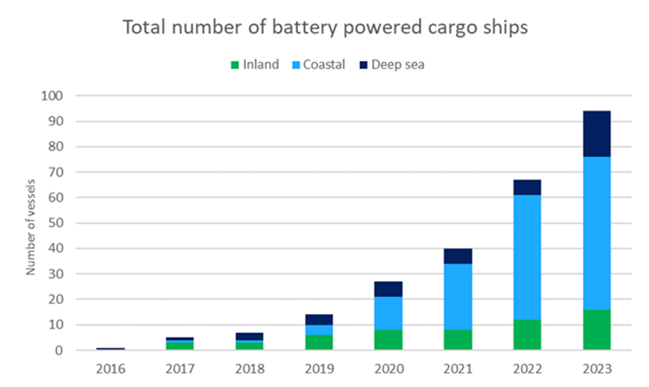 Did you know that there are already 94 cargo ships with a battery system installed? About 17% of these are inland cargo ships, 64% are coastal cargo ships, and 19% are ocean-going cargo ships. The Maritime Battery Forum is collaborating with CIMAC on a study to define the “Environment for battery use on-board ocean-going cargo ships”. The goal of this study is to find our when, where, and how using batteries is realistic and advantageous on-board ocean-going cargo ships.