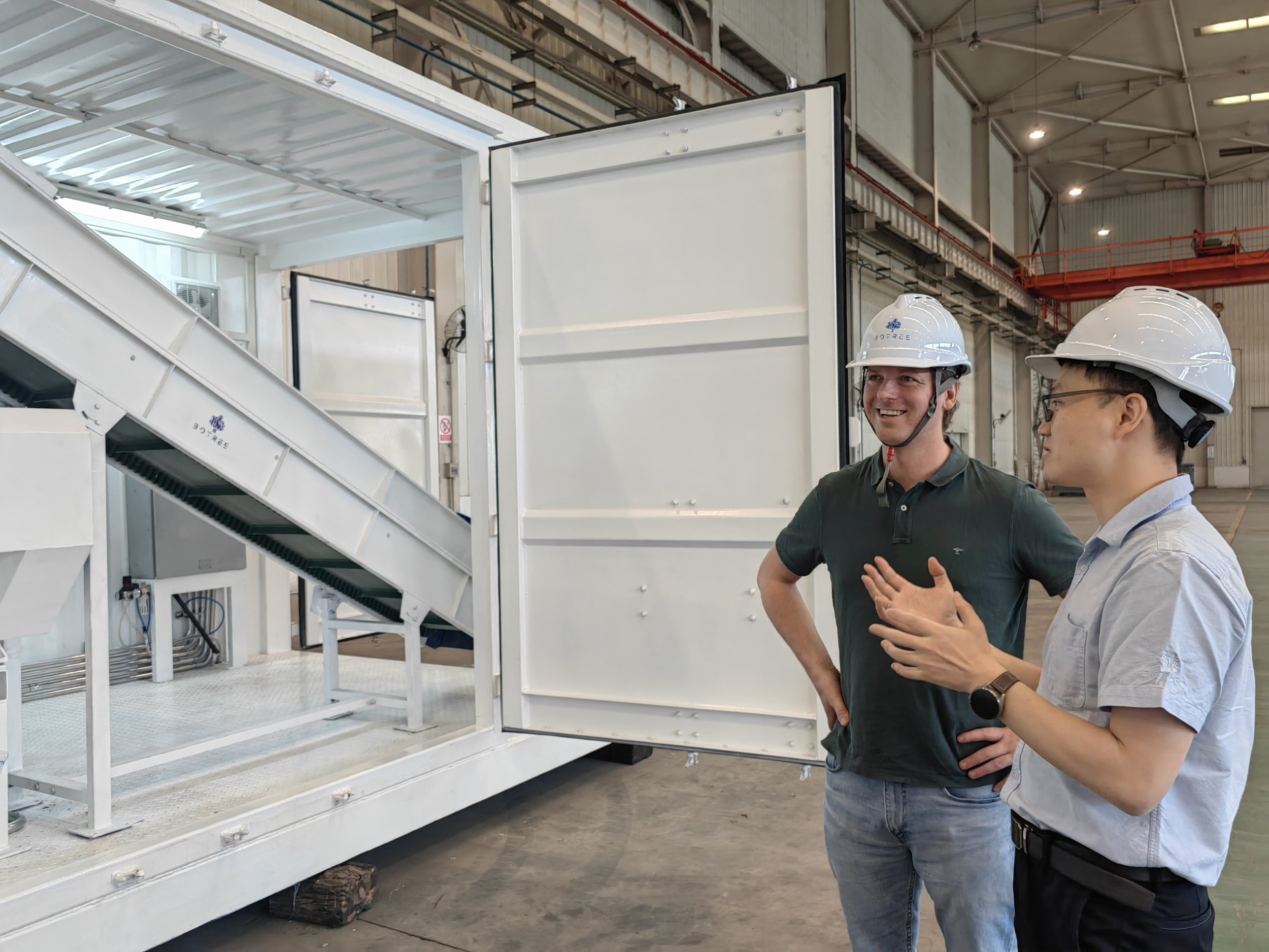Our visit to China started at a factory of Botree Cycling. Botree Cycling manufactures equipment for battery recycling plants. They aim to provide a full solution for the recycling of critical battery materials. Through the innovation of separation systems and intelligent equipment, Botree Cycling enables recycling enterprises and manufacturers of batteries or electric vehicles to realize a short, closed, and sustainable cycle of battery materials. Botree Cycling also showed their containerized battery recycling solutions, which can be used for pilot plants.