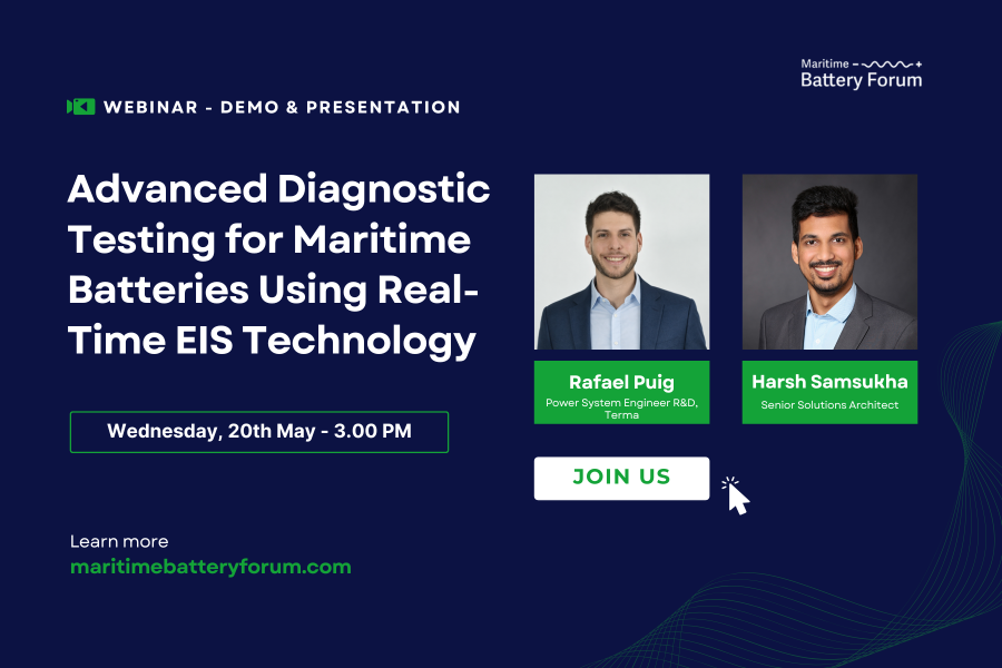 Rafael Puig, Power System Engineer R&D, Terma and Harsh Samsukha, Senior Solutions Architect, Safion will be discussing more on this in a webinar showcasing how real-time Electrochemical Impedance Spectroscopy (rapidEIS) can transform battery diagnostics in the maritime industry by featuring live demos of real use cases. Join us on Wednesday, 20 May 2026 at 3pm!